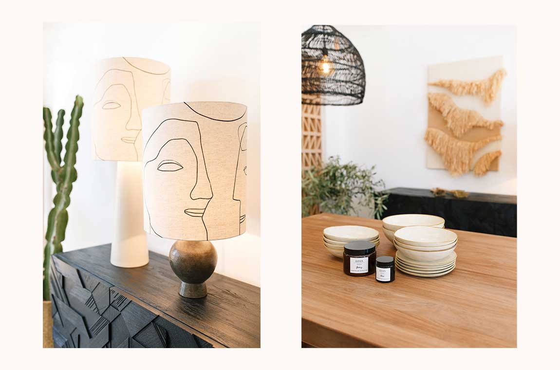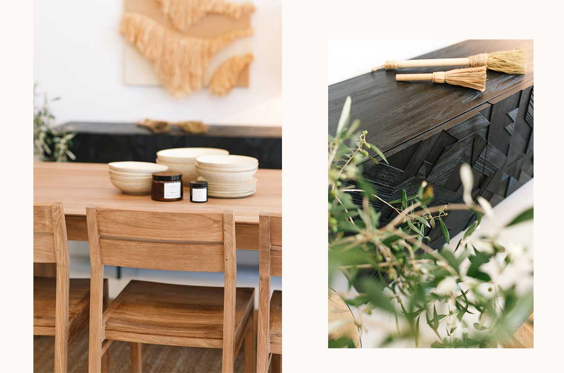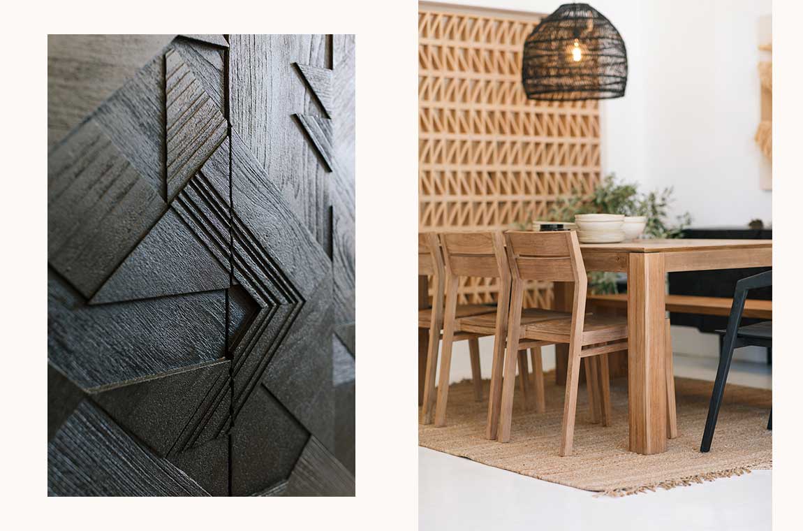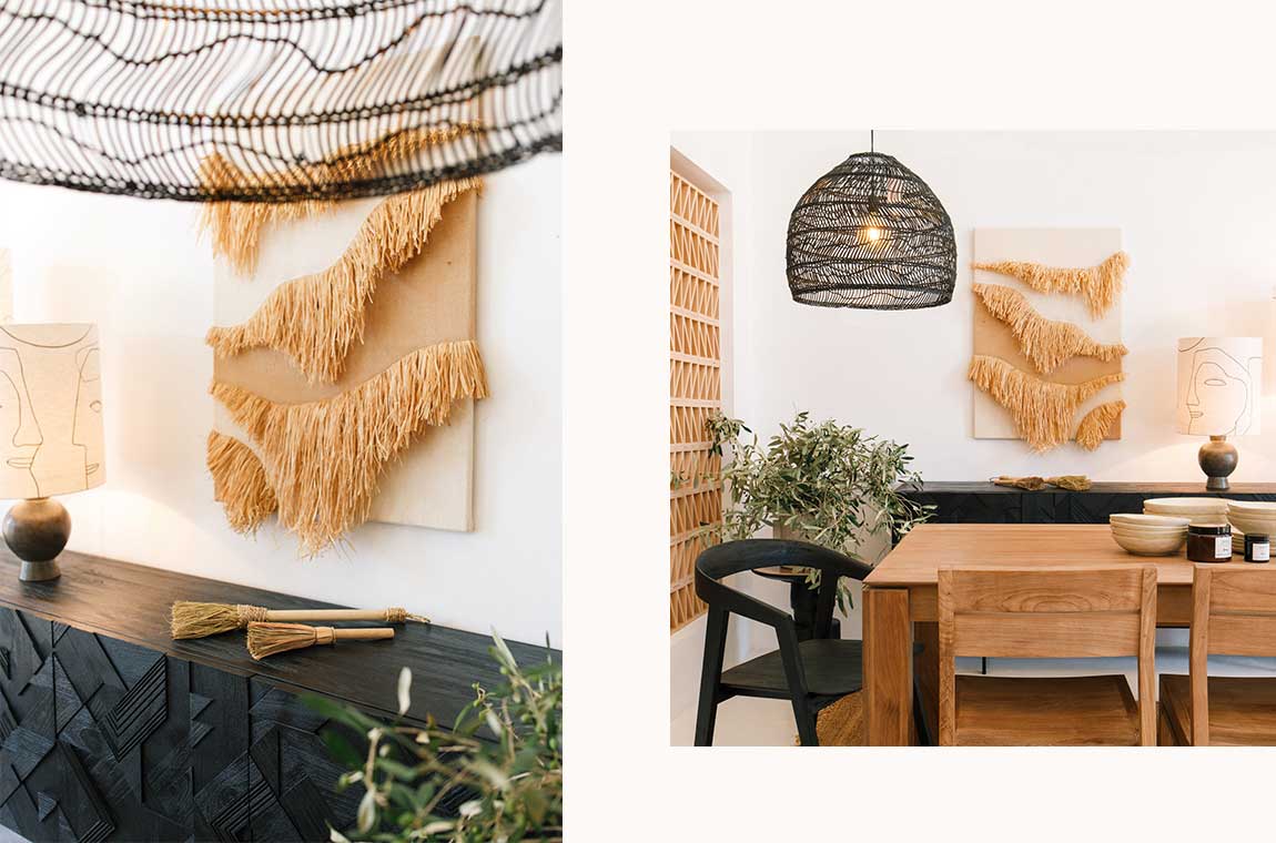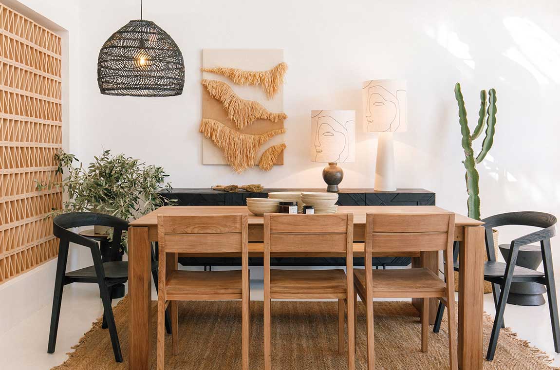“The purity of wood and rattan connecting with shades of black forming this dinning space.”